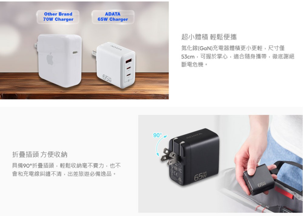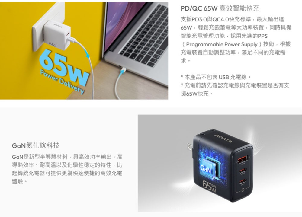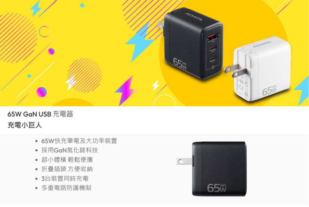威剛65W GaN氮化鎵充電器(3孔) (白) (黑)