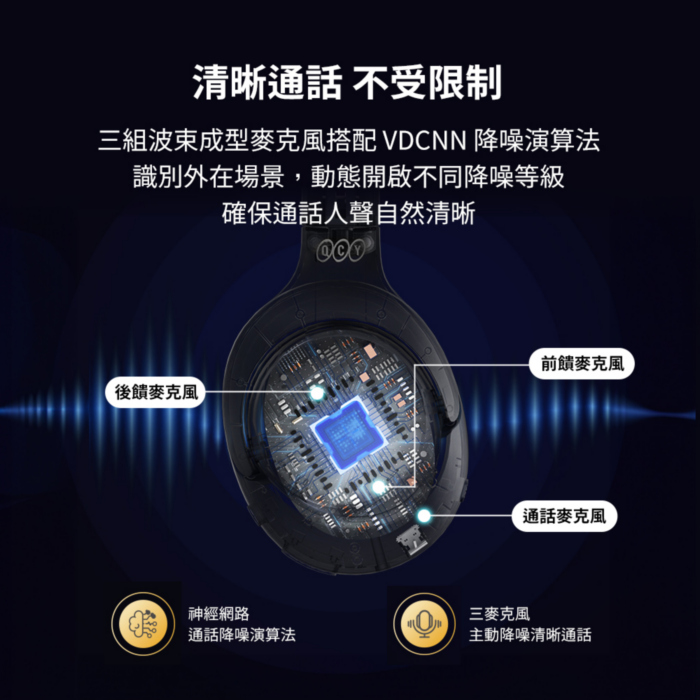 清晰通話 不受限制|3 組波束成形麥克風搭配 VDCNN 降噪演算法,智慧識別外在場景,動態開啟不同降噪等級,確保通話人聲自然清晰