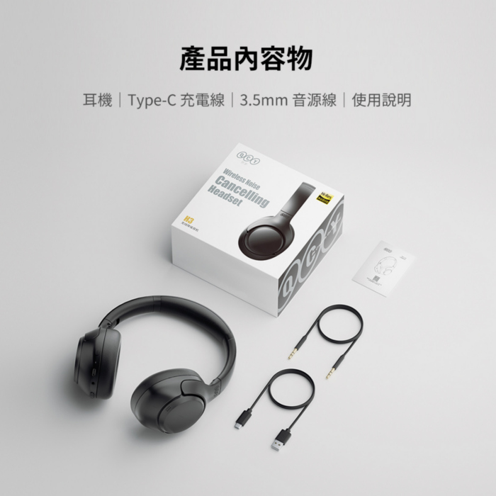 配件:使用說明、USB-C to USB-A 充電線、3.5mm音源線、耳機本體