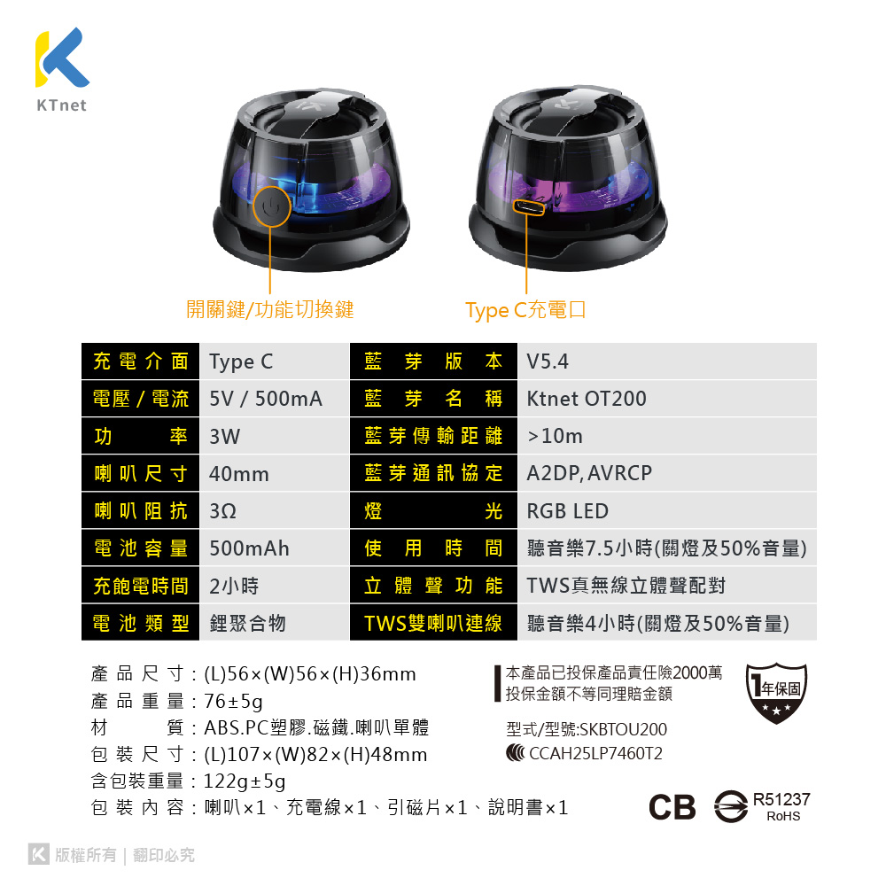 包裝內容 : 喇叭×1、充電線×1、引磁片×1、說明書×1