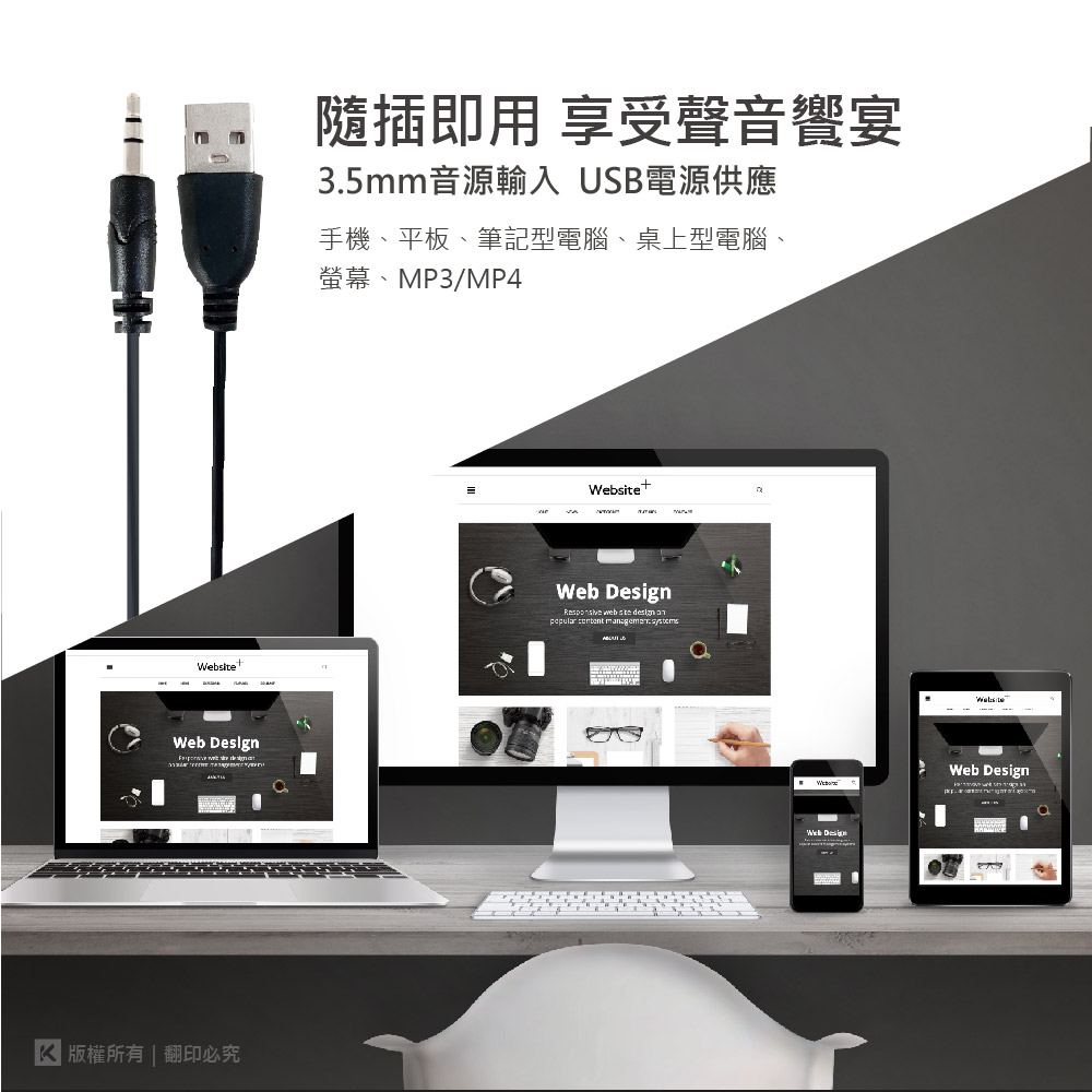 ■USB接頭供電 AUX 3.5MM音源插頭。