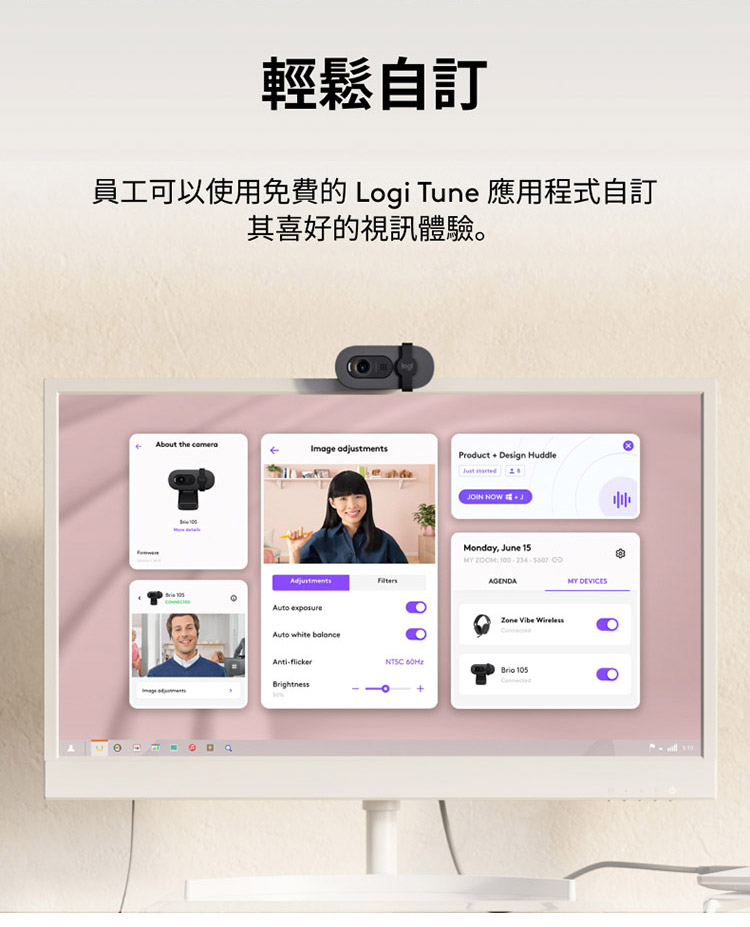 員工可以使用免費的 Logi Tune 應用程式自訂其喜好的視訊體驗。