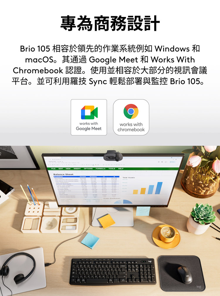 利用羅技 Sync 輕鬆部署與監控 Brio 105。三年有限保固讓您放心無憂。