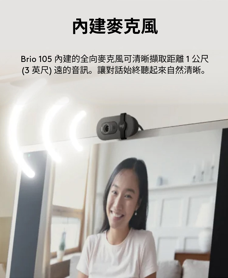 Brio 105 內建的全向麥克風可清晰擷取距離 1 公尺 (3 英尺) 遠的音訊。