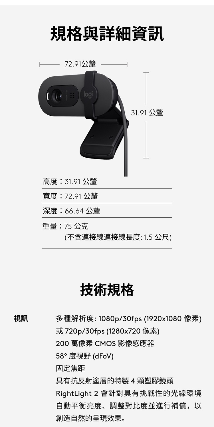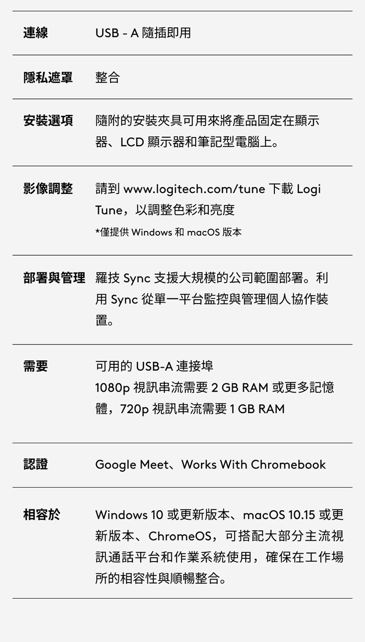 請到 www.logitech.com/tune下載 Logi Tune,以調整色彩和亮度。