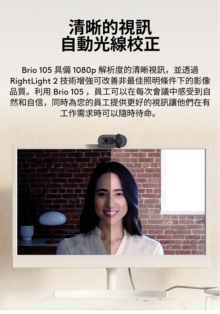 Brio 105 可產生 1080p 解析度的清晰視訊透過