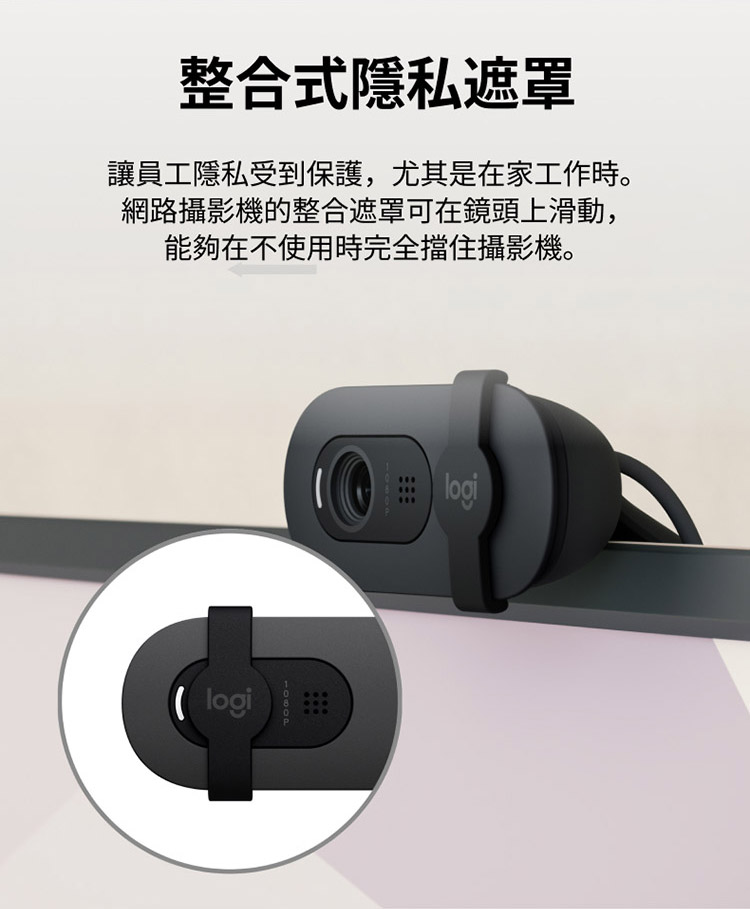 Full HD 1080p 商務網路攝影機,配備自動光線平衡與整合式隱私遮罩。