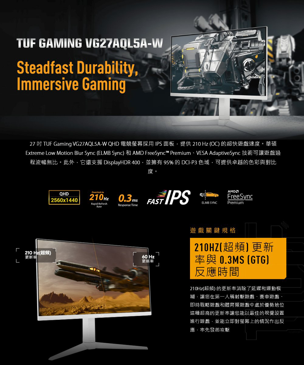TUF Gaming VG27AQL5A-W 電競螢幕 – 27 吋、QHD(2560x1440)、