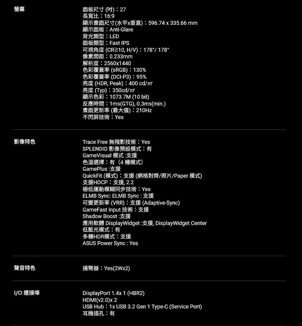 27 吋 QHD(2560x1440) Fast IPS 電競螢幕,具備 210Hz (超頻) 更新率,