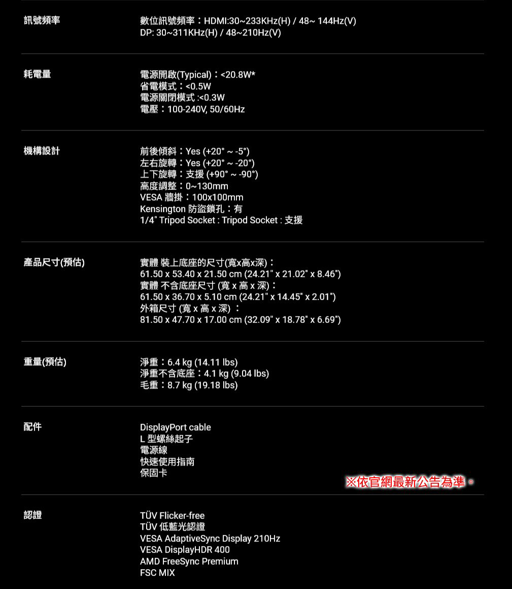 配件 DisplayPort cable/L 型螺絲起子/電源線/快速使用指南/保固卡