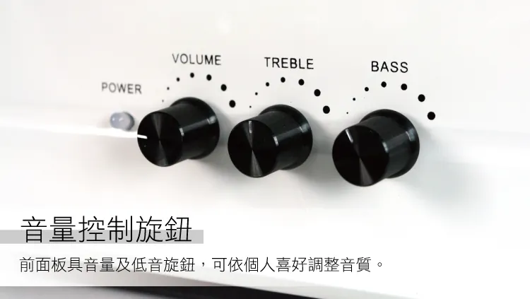 功能 : 電源開關、電源指示燈、音量旋鈕、高音旋鈕、低音旋鈕