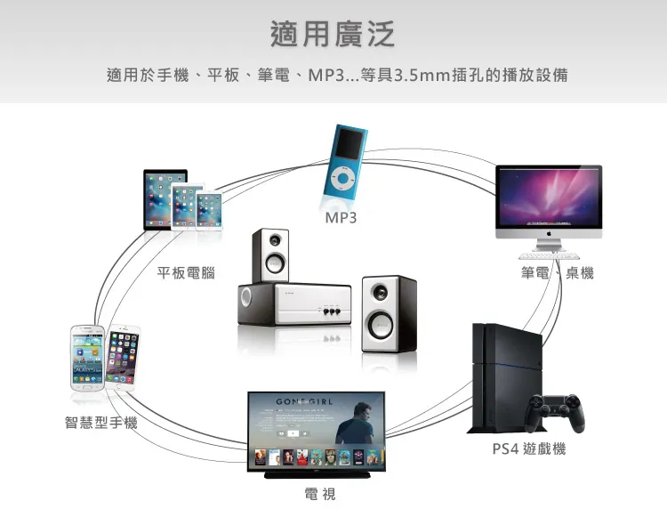 適合搭配各式PC/MP3/iPod/遊樂器/隨身聽等播放設備。