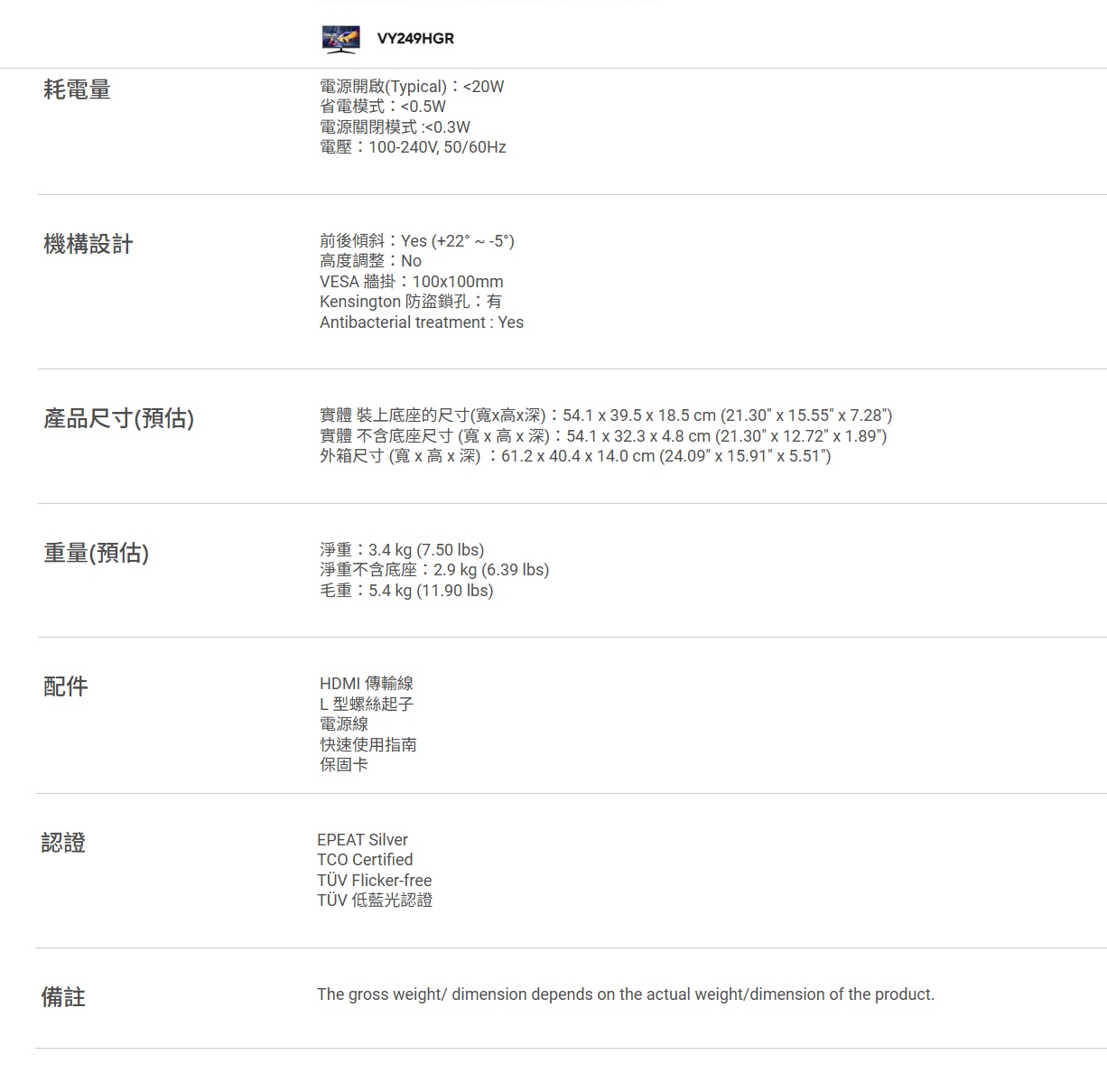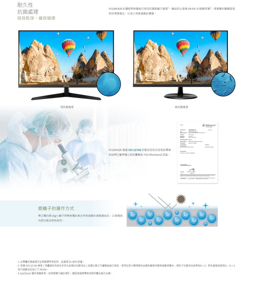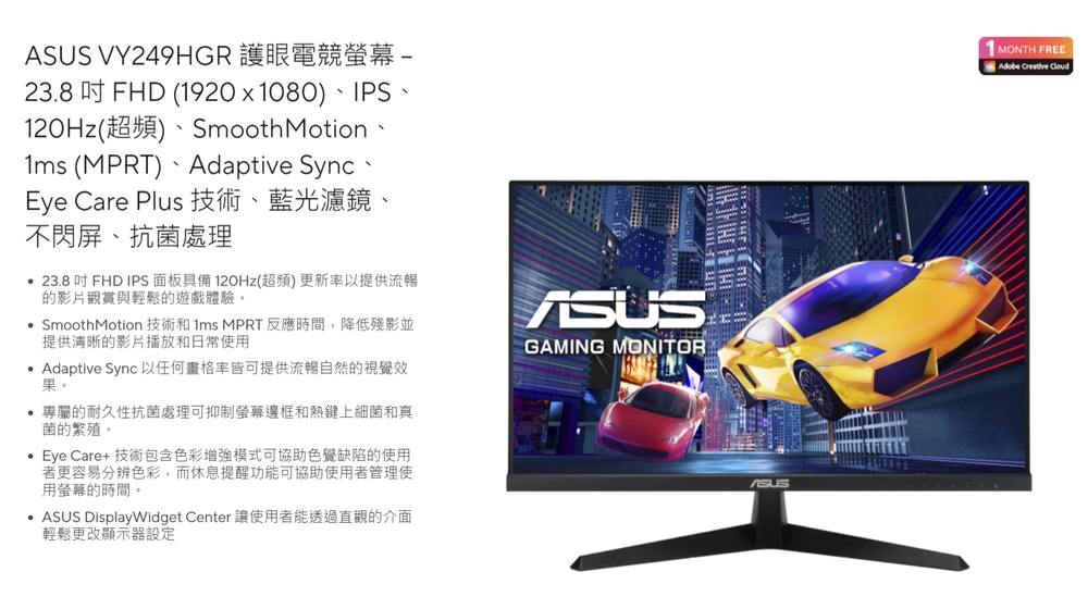 1ms (MPRT)、Adaptive Sync、Eye Care Plus 技術、藍光濾鏡、不閃屏、抗菌處理