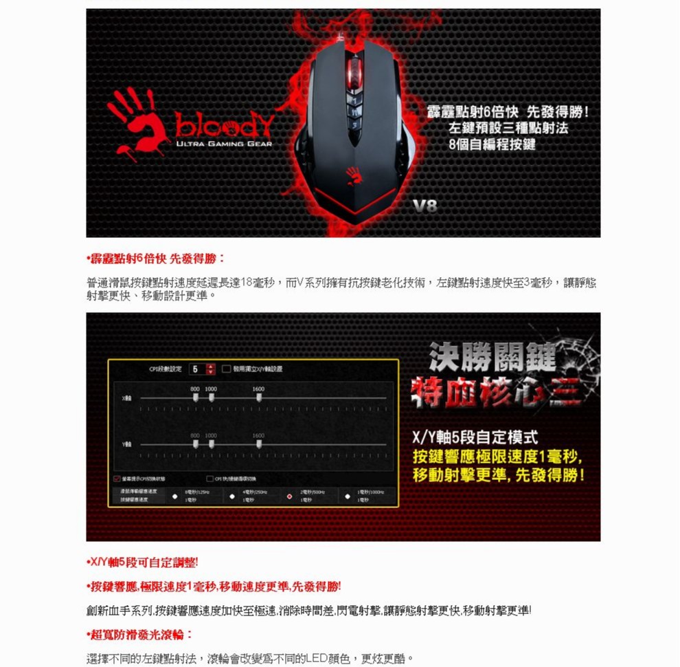 【A4 Bloody】V8 血手令智慧多核左3槍 光學滑鼠