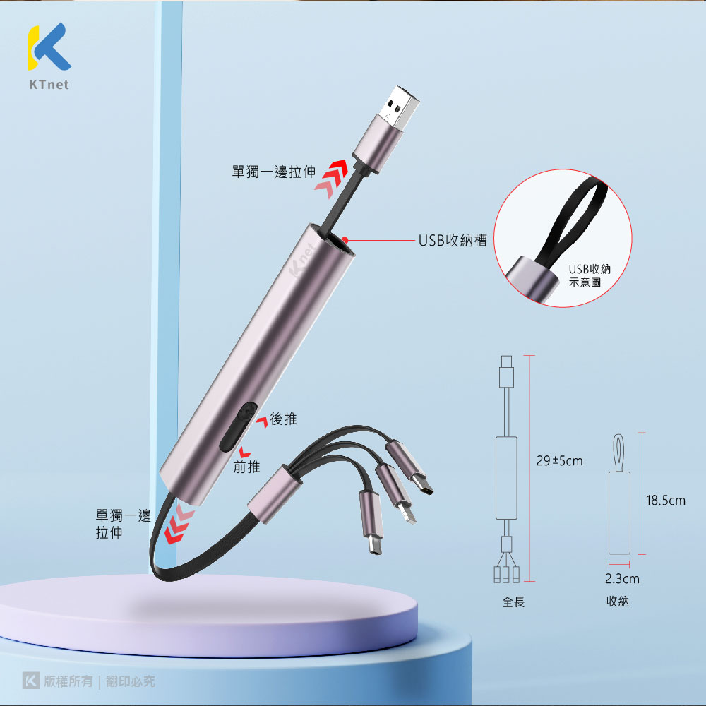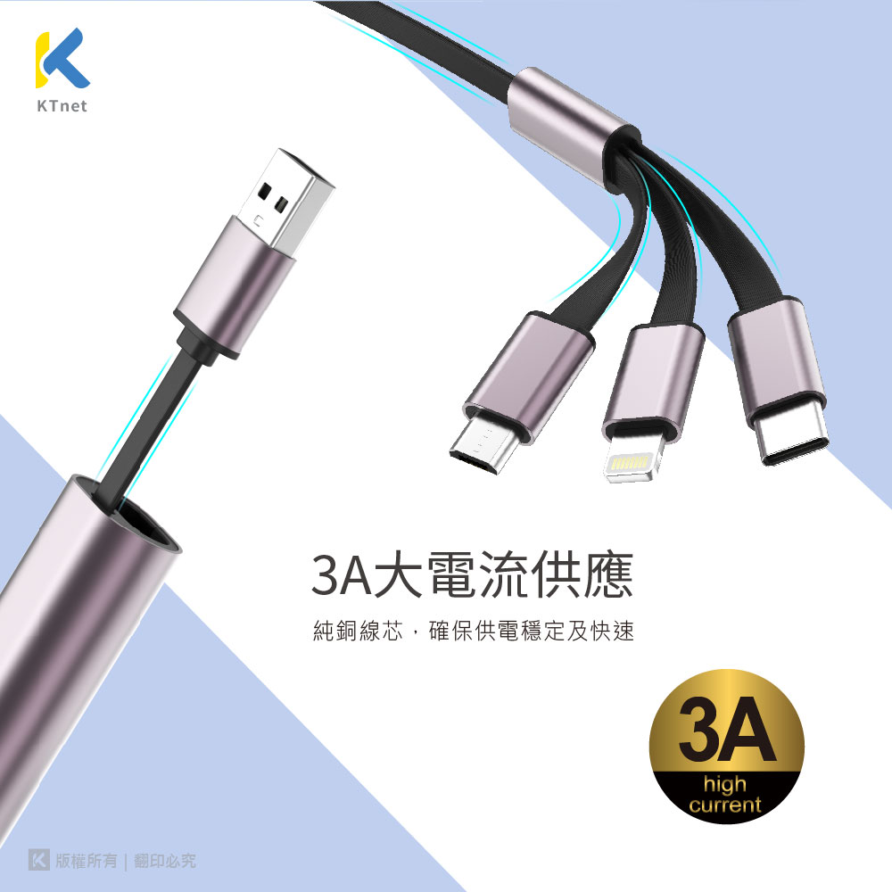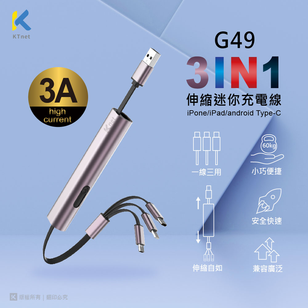 KTNET G49伸縮收納棒型的鋁合金充電線/3合1的多介面充電/充電3A大電流供應/純銅線芯供電穩定及快速