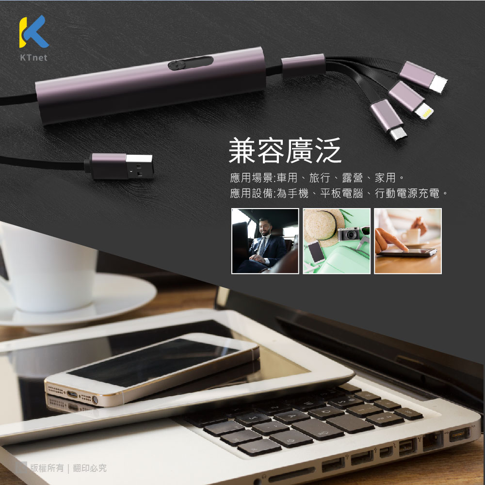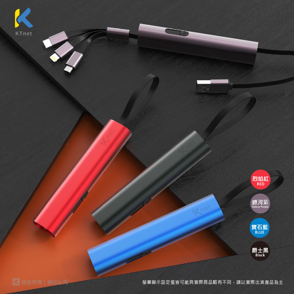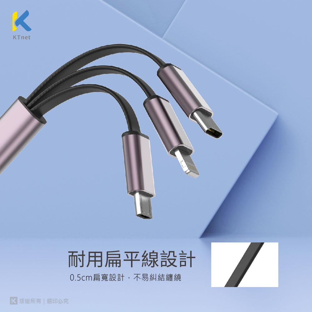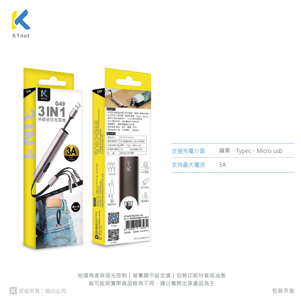 KTNET G49伸縮收納棒型的鋁合金充電線/3合1的多介面充電/充電3A大電流供應/純銅線芯供電穩定及快速